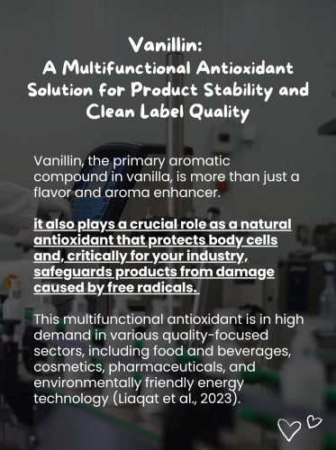 Vanillin, the primary aromatic compound in vanilla, is more than just a flavor and aroma enhancer. It also plays a crucial role as a natural antioxidant that protects body cells and, critically for your industry, safeguards products from damage caused by free radicals. This multifunctional antioxidant is in high demand in various quality-focused sectors, including food and beverages, cosmetics, pharmaceuticals, and environmentally friendly energy technology (Liaqat et al., 2023).