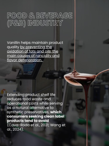 Vanillin helps maintain product quality by preventing the oxidation of fats and oils, the main causes of rancidity and flavor deterioration. Extending product shelf life reduces food waste and operational costs while serving as a natural alternative to synthetic preservatives, which consumers seeking clean label products tend to avoid (Cava-Roda et al., 2021; Wang et al., 2024).