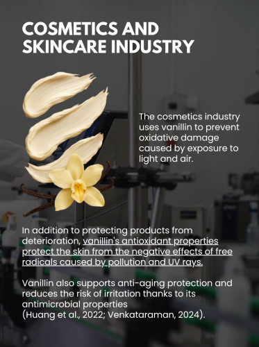 The cosmetics industry uses vanillin to prevent oxidative damage caused by exposure to light and air. In addition to protecting products from deterioration, vanillin's antioxidant properties protect the skin from the negative effects of free radicals caused by pollution and UV rays. Vanillin also supports anti-aging protection and reduces the risk of irritation thanks to its antimicrobial properties (Huang et al., 2022; Venkataraman, 2024).