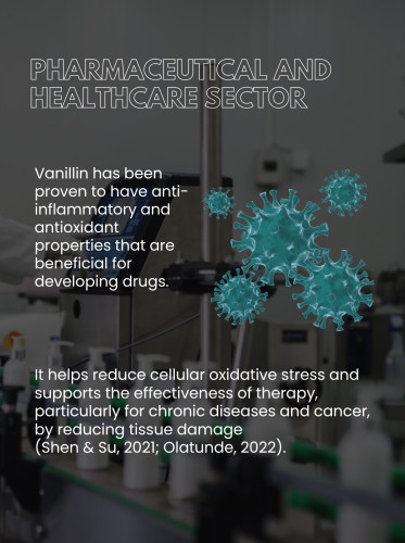 In the pharmaceutical sector, vanillin has been proven to have anti-inflammatory and antioxidant properties that are beneficial for developing drugs. It helps reduce cellular oxidative stress and supports the effectiveness of therapy, particularly for chronic diseases and cancer, by reducing tissue damage (Shen & Su, 2021; Olatunde, 2022).