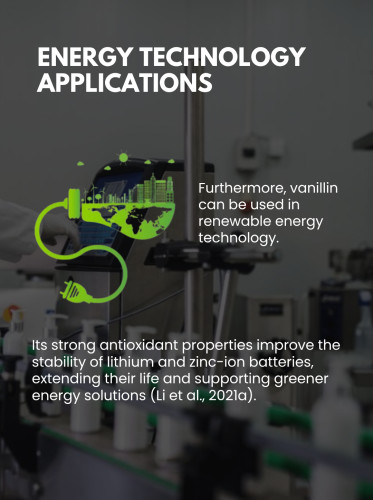 Furthermore, vanillin can be used in renewable energy technology. Its strong antioxidant properties improve the stability of lithium and zinc-ion batteries, extending their life and supporting greener energy solutions (Li et al., 2021a).