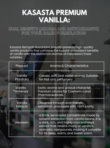 Kasasta Rempah Nusantara proudly presents high-quality vanilla products that combine the natural antioxidant benefits of vanillin with the distinctive aromas of Indonesia's finest varieties.