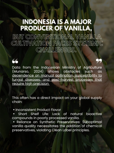 Indonesia is a major producer of vanilla, but conventional vanilla cultivation faces systemic challenges. Data from the Indonesian Ministry of Agriculture (Munarso, 2024) shows obstacles such as dependence on manual pollination, susceptibility to fungal diseases, and post-harvest processes that require high precision. This often has a direct impact on your global supply chain: