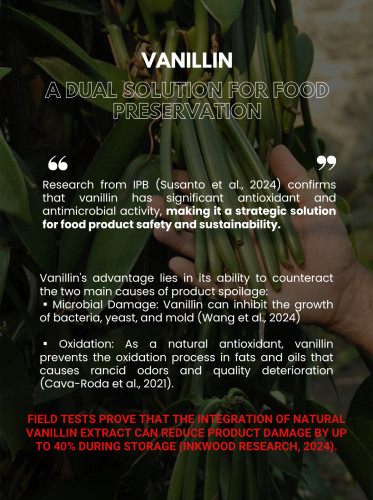 The latest innovations in the food industry have revealed the extraordinary potential of vanillin as an effective natural preservative. Research from IPB (Susanto et al., 2024) confirms that vanillin has significant antioxidant and antimicrobial activity, making it a strategic solution for food product safety and sustainability.